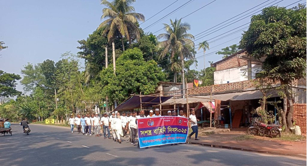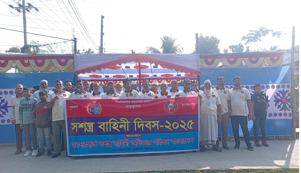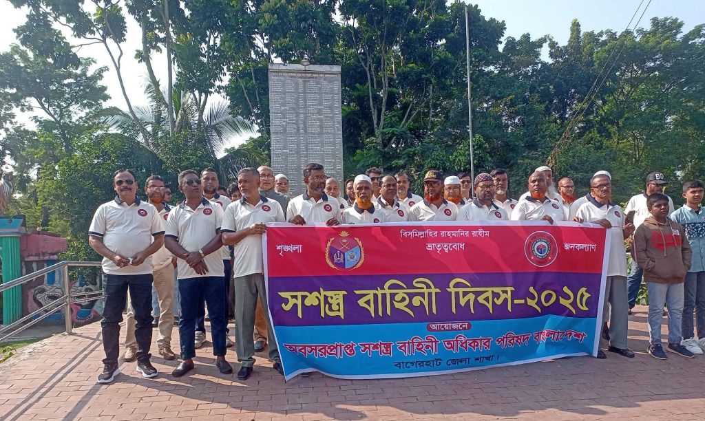 উৎসাহ-উদ্দীপনার মধ্য দিয়ে সশস্ত্র বাহিনী দিবস উদযাপিত হয়েছে।সশস্ত্র বাহিনী দিবস-২০২৫’ উপলক্ষ্যে বাগেরহাটে যথাযোগ্য মর্যাদায় সশস্ত্র বাহিনী দিবস পালিত হয়েছে।এ উপলক্ষে বিস্তারিত কর্মসূচি গ্রহণ করা হয় শুক্রবার (২১ নভেম্বর) সকালে অবসরপ্রাপ্ত সশস্ত্র বাহিনী অধিকার পরিষদ বাংলাদেশ-এর বাগেরহাট জেলা শাখার উদ্যোগে শহরের সোনাতলা এলাকা থেকে একটি বর্ণাঢ্য র্যালি বের করা হয়। র্যালিটি সংগঠনের কার্যালয় চত্বর থেকে শুরু হয়ে দশানী মুক্তিযোদ্ধা স্মৃতিস্তম্ভে গিয়ে শ্রদ্ধা নিবেদন করে আবার সংগঠনের কার্যালয়ের সামনে এসে শেষ হয়। পরে সংগঠন কার্যালয় চত্বরে এক আলোচনা সভা অনুষ্ঠিত হয়