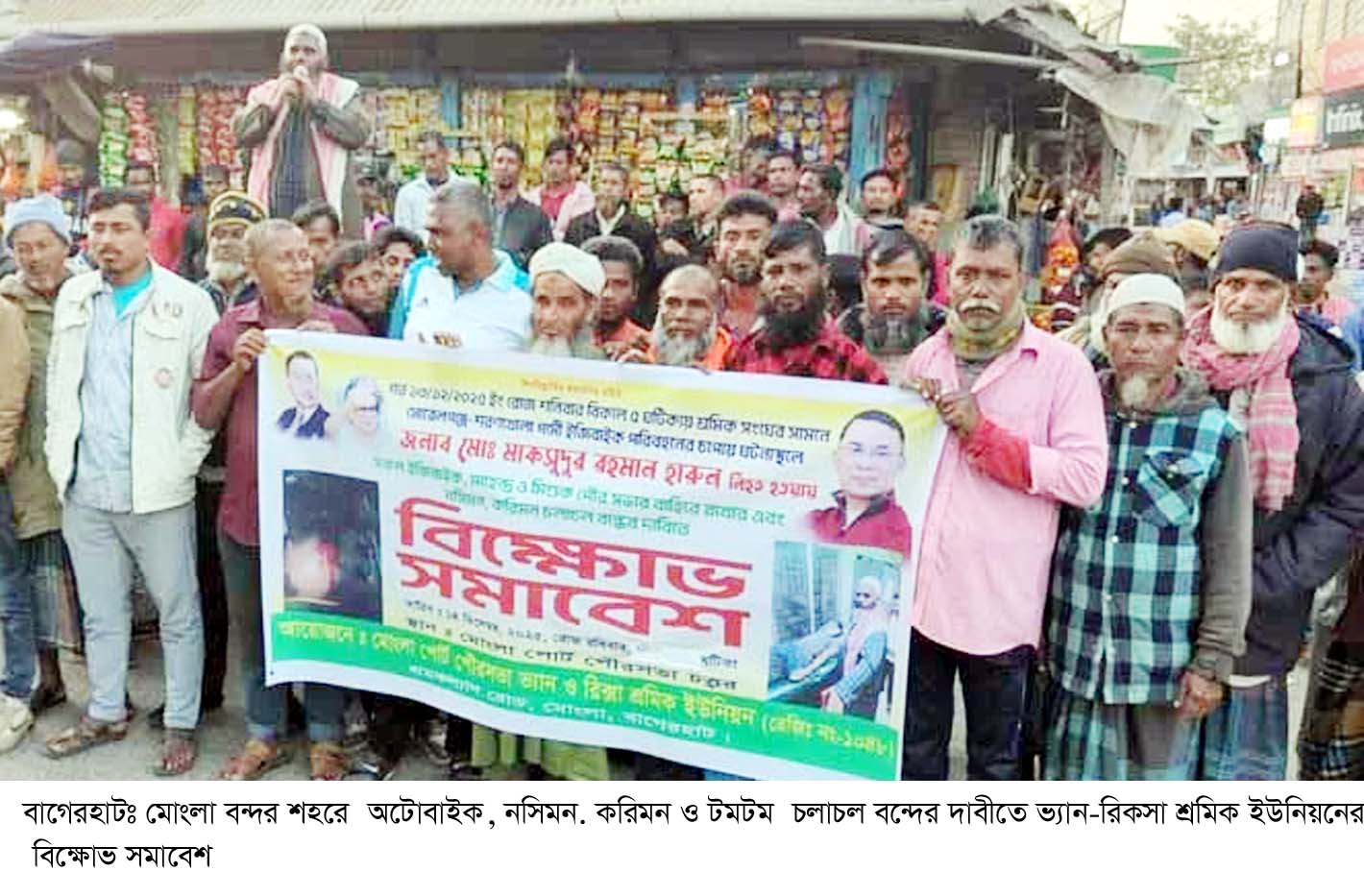 বাগেরহাটের মোংলা বন্দর শহরে অবৈধ যান চলাচল বন্ধের দাবীতে বিক্ষোভ মিছিল ও সমাবেশ করেছে ভ্যান ও রিকশা শ্রমিক ইউনিয়নের ব্যানারে সাধারন মানুষ। একের পর এক দুর্ঘটনা ও শহরের যানযট এড়াতে ইজিবাইক, মাহেন্দ্র, টমটম ও মিশুক পৌর শহরের বাহিরে রাখা এবং মোংলা শহরে নসিমন-করিমন চলাচল বন্ধের দাবীতে রবিবার বিকেলে এ কর্মসূচি পালন করা হয়। শহরের শ্রম কল্যাণ সড়কের নিজস্ব কার্যালয় থেকে বের হওয়া বিক্ষোভ মিছিল পৌর শহরের প্রধান প্রধান সড়ক প্রদক্ষিণ করে। পরে শহরের চৌধুরীর মোড়ে সমাবেশে করে। এ সময় অন্যান্যের মধ্যে বক্তব্য রাখেন ভ্যান-রিক্সা শ্রমিক ইউনিয়নের সভাপতি আঃ সালাম ব্যাপারী ও সাধারণ সম্পাদক হাওলাদার শহিদুল ইসলাম। সমাবেশে বক্তারা বলেন, গত শনিবার সন্ধ্যায় অবৈধ বেপরোয়া ইজিবাইক চাপায় মাকসুদুর রহমান হারুন নামের একজন ব্যবসায়ী নিহত হন। এছাড়াও প্রায়ই এই অবৈধ যানে নানা ধরণের দুর্ঘটনা ঘটছে। সেই সাথে শহরে লেগেই থাকছে যানজট। তাই পৌর শহরে এসব অবৈধ যান চলাচল বন্ধ করতে হবে। শনিবার এ সড়ক দুর্ঘটনার পর পরই সকল ধরনের অটো ইজিবাইক, মাহেন্দ্র, নছিমন ও টমটম মোংলা শহরে প্রবেশ বন্ধ করে দেয়া হয় সংগঠনের পক্ষ থেকে।#az