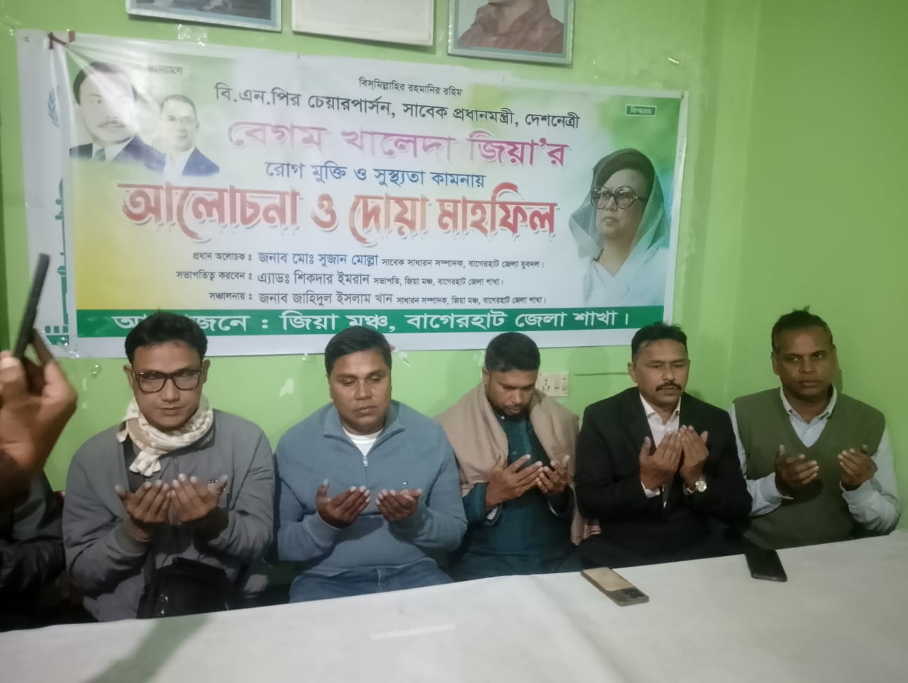 সাবেক প্রধানমন্ত্রী ও বিএনপির চেয়ারপার্সন বেগম খালেদা জিয়ার রোগমুক্তি, সুস্থ্যতা দীর্ঘায়ু কামনায় বাগেনহাট জেলা জিয়া মঞ্চের উদ্যোগে আলোচনা সভা ও দোয়া মাহফিল অনুষ্ঠিত হয়েছে।