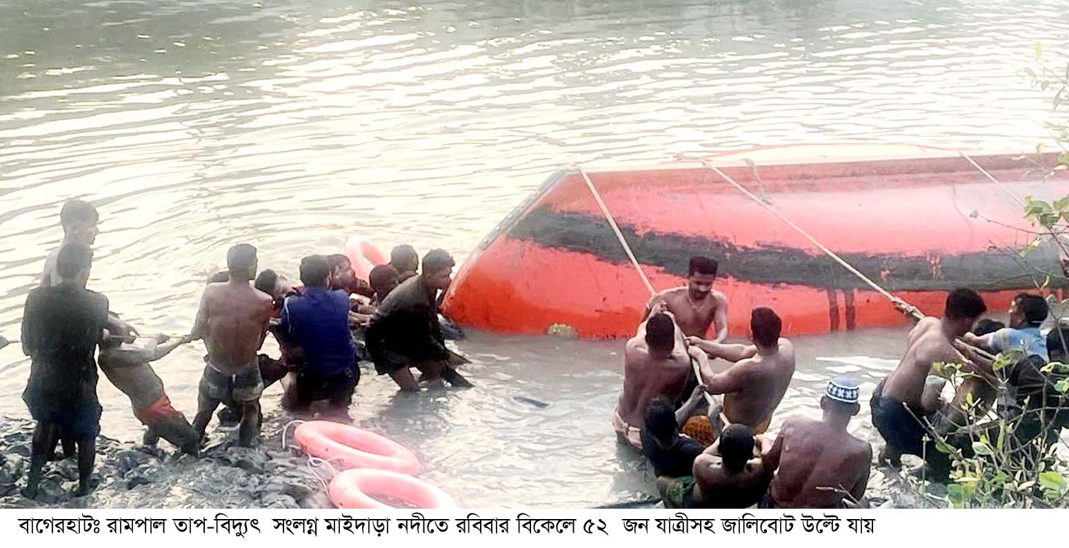 বাগেরহাটের রামপালে নদীপথে বেড়াতে আসা নারী ও শিশুসহ ৫২ জন যাত্রী নিয়ে জালি বোট উল্টে নদীতে ভাসমানদের উদ্ধার করেছে তাপ-বিদ্যুৎকতৃপক্ষ। এ সময় স্থানীয় মইদাড়া নদীতে ভেসে যাওয়া নারী, শিশু ও বৃদ্ধসহ ২০ জনকে প্রাথমিক দিয়েছে রামপাল বিদ্যুৎ কেন্দ্র কর্তৃপক্ষ। রামপাল থানার ওসি আতিকুর রহমান জানান, খুলনা জেলার দাকোপ উপজেলার চালনা ও বাইনতলা থেকে ৫২ জন লোক একটি ইঞ্জিন চালিত নৌকায় করে রামপাল তাপ-বিদ্যুৎ কেন্দ্রের নিকটবর্তী গৌরম্ভা এলাকায় একটি পারিবারিক অন্নপ্রাশন অনুষ্ঠানশেষে বাড়ী ফেরার পথে রবিবার বিকাল ৫ টার দিকে দূর্ঘটনাবশত বোটটি উল্টে যায়। ঘটনাটি রামপাল বিদ্যুৎ কেন্দ্রের প্রধান গেটের কাছাকাছি হওয়ার দুর্ঘটনার শব্দে প্রধান গেটে কর্তব্যরত সিকিউরিটি গার্ডদের নজরে আসলে সাথে সাথে তারা সিকিউরিটি কন্ট্রোল রুমে অবহিত করে। সিকিউরিটি কন্ট্রোল রুম থেকে তাৎক্ষণিকভাবে একটি মেডিকেল টিম এবং রামপাল বিদ্যুৎ কেন্দ্রে নিয়োজিত ফায়ার এন্ড সেফটি টিমকে অবহিত করে। কিছু লোক সাঁতার কেটে তীরে আসলেও বৃদ্ধ এবং শিশুরা নৌকার নিচে আটকা পড়ে যায়। বিদ্যুৎ কেন্দ্রের সিকিউরিটি, ফায়ার এন্ড সেফটি এবং মেডিকেল টিম তাদেরকে উদ্ধার করে দ্রæত এ্যাম্বুলেন্সে করে রামপাল বিদ্যুৎ কেন্দ্রের হাসপাতালে নিয়ে যায়। ওই দুর্ঘটনায় নৌকাটিতে বৃদ্দ, নারী ও শিশু সহ ২০ জন লোক আহত হয়। রামপাল বিদ্যুৎকেন্দ্রর উপ-মহাব্যবস্থাপক ও মহাব্যবস্থাপক (ভারপ্রাপ্ত) তরিকুল ইসলাম দ্রæত হাসপাতাল পরিদর্শন করেন, দুর্ঘটনা কবলিত ব্যক্তিদের সাথে কথা বলেন এবং দ্রæত তাদের চিকিৎসা দেওয়ার জন্য প্রয়োজনীয় ব্যবস্থা গ্রহণ করেন। ফলে এই শীতের মধ্যে বড় হতাহতের হাত থেকে সকলে রক্ষা পেয়েছেন। কর্তব্যরত চিকৎসক ডা. আব্দুল্লাহ আল নোমান বলেন, সকলকে দ্রæত চিকিৎসা দেয়া হয়েছে এবং সকলেই বিপদমুক্ত আছে তাদেরকে কিছু সময় অবজারভেশনে রাখা হয়। #