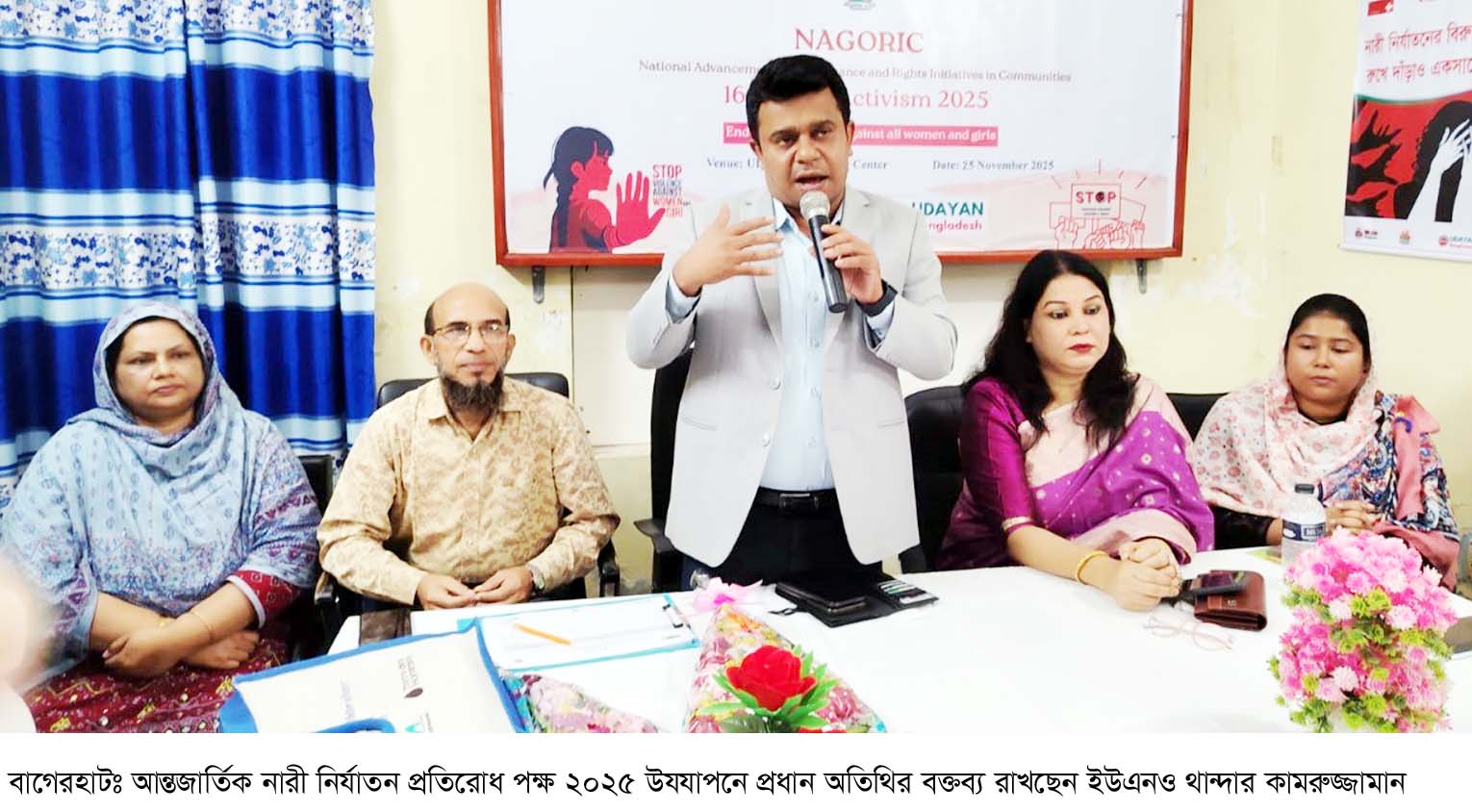 আন্তর্জাতিক নারী নির্যাতন প্রতিরোধ পক্ষ-২০২৫ উদযাপন উপলক্ষে বাগেরহাটে র্যালী ও আলোচনা সভা অনুষ্ঠিত হয়েছে। বেসরকারী উন্নয়ন সংস্থা জেলা শহরের খারদ্বার এলাকায় উদয়ন বাংলাদেশ-এর প্রধান কার্যালয়ে নাগরিক প্রকল্পের আওতায় মঙ্গলবার এ অনুষ্ঠানটি যৌথভাবে আয়োজন করে উদয়ন বাংলাদেশ ও আমরাই পারি পারিবারিক নির্যাতন প্রতিরোধ জোট। সার্বিক সহযোগিতায় এম্বাসি অব সুইজারল্যান্ড, গেøাাবাল অ্যাফেয়ার্স কানাডা ও মানুষের জন্য ফাউন্ডেশনের (এমজেএফ) আর্থিক সহায়তায় আয়োজিত আন্তর্জাতিক নারী নির্যাতন প্রতিরোধ পক্ষের এবারের প্রতিপাদ্য বিষয় ছিল ‘নারী ও কন্যার প্রতি সহিংসতা বন্ধে ঐক্যবদ্ধ হই, ডিজিটাল নিরাপত্তা নিশ্চিত করি’। এ অনুষ্ঠানে বাগেরহাট সদর উপজেলা নির্বাহী অফিসার থান্দার কামরুজ্জামান উপস্থিত হয়ে প্রধান অতিথি হিসাবে বক্তব্য রাখেন। এখানে বিশেষ অতিথি ছিলেন সদর উপজেলার কাড়াপাড়া ইউনিয়ন পরিষদের প্রশাসক ও উপজেলা মাধ্যমিক শিক্ষা অফিসার এস.এম মোর্শেদ, মহিলা বিষয়ক অধিদপ্তরের জেন্ডার স্পেশালিষ্ট মোঃ মুজাহিদুল ইসলাম। এ ছাড়া বক্তব্য রাখেন উপজেলা নাগরিক প্লাটফর্মের সভাপতি প্রভাষক কামরুল ইসলাম, এনজিও ব্যাক্তিত্ব গোপী নাথ সাহা, ডিস্ট্রিক্ট পলিসি ফোরাম (ডিপিএফ) সাধারণ সম্পাদক নাদিরা আকরাম প্রমুখ। এ অনুষ্ঠানে সভাপতিত্ব করেন উদয়ন বাংলাদেশ এর নির্বাহী পরিচালক সাংবাদকর্মী ইসরাত জাহান। #az