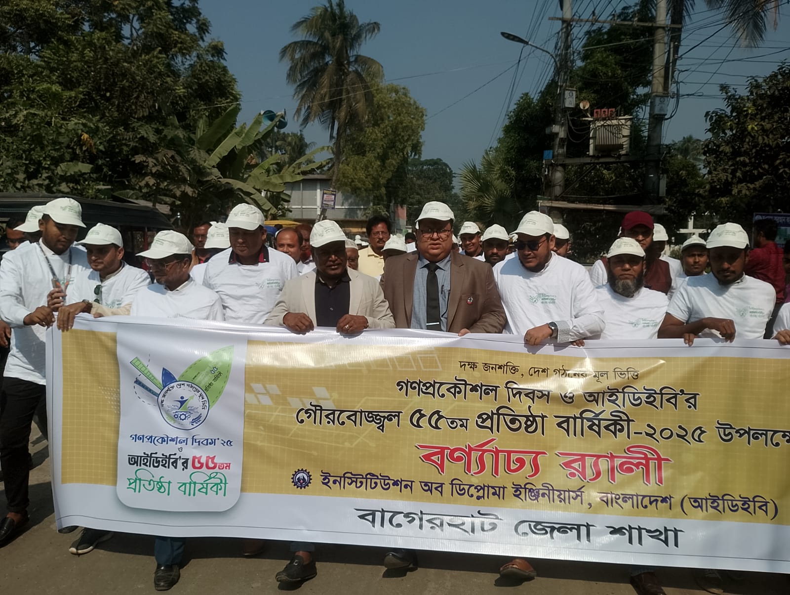 বাগেরহাটে গণ প্রকৌশল দিবস ও আইডিইবির ৫৫তম প্রতিষ্ঠা বার্ষিকীতে বাগেরহাটে বর্নাঢ্য র্যালী ও পথসভা অনুষ্ঠিত হয়েছে। সোমবার দুপুরে শহরের অফিসার্স ক্লাবের সামনে থেকে আইডিবি (ইনস্টিটিউশন অব ডিপ্লোমা ইঞ্জিনীয়ার্স, বাংলাদেশ) বাগেরহাট জেলা শাখার উদ্যোগে র্যালীটি বের করা হয়। বিভিন্ন সড়ক প্রদক্ষিন করে র্যালীটি শহরের কেন্দ্রীয় শহীদ মিনারের সামনে শেষ হয়।