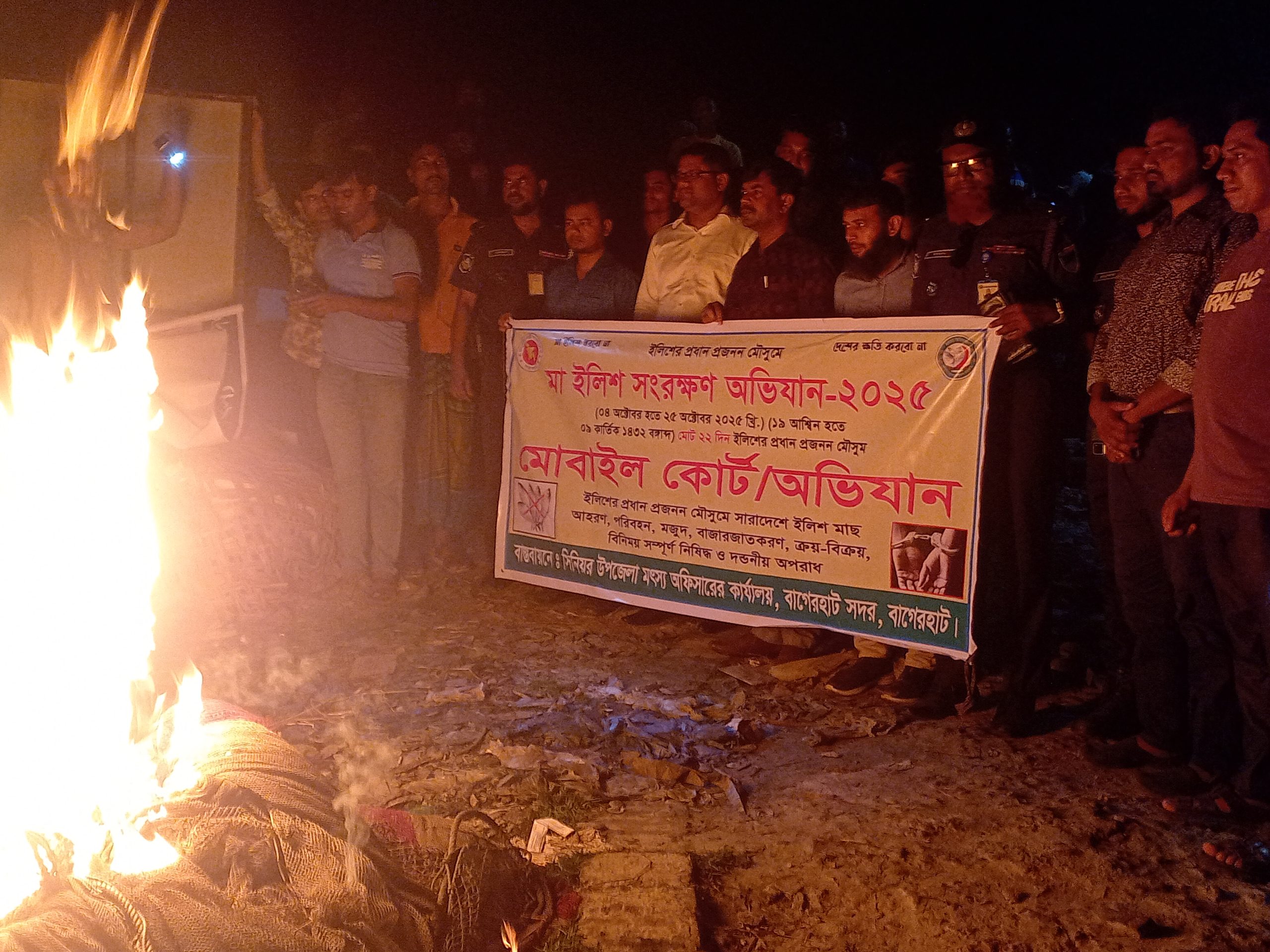 'মা ইলিশ সংরক্ষণ অভিযান - ২০২৫' - কে সফল করতে ভৈরব নদীতে বিভিন্ন জায়গায় অভিযানসহ বাগেরহাট উপজেলার দড়াটানা নদীর বিভিন্ন স্থানে এ অভিযান ও মোবাইল কোর্ট পরিচালনা করা হয়।অভিযানে এডিশনাল এসপি মোঃ শামীম এর নেতৃত্বে আজ ২০ অক্টোবর (সোমবার) দিনব্যাপী এই কর্মসূচিতে জেলা মৎস অফিসার রাজকুমার বিশ্বাস,বাগেরহাট সদর উপজেলা নির্বাহী অফিসার এস এম মুস্তাফিজুর রহমান, বাগেরহাট সদর উপজেলা মৎস্য কর্মকর্তা মো. ফেরদৌস আনসারীসহ সংশ্লিষ্টরা অংশ নেন। এই সময় জেলেদের কাছ থেকে প্রায় সাড়ে চার হাজার মিটারের আটটি বেহুন্দিজাল উদ্ধার করা হয়। যার বাজার মূল্য প্রায় তিন লক্ষ টাকা। আজ সন্ধ্যায় বাগেরহাট কেবি মৎস্য বাজার প্রাঙ্গণে উদ্ধারকৃত জাল গুলি পুড়িয়ে ধ্বংস করা হয়। জেলা মৎস্য অফিস এর আয়োজন করে।