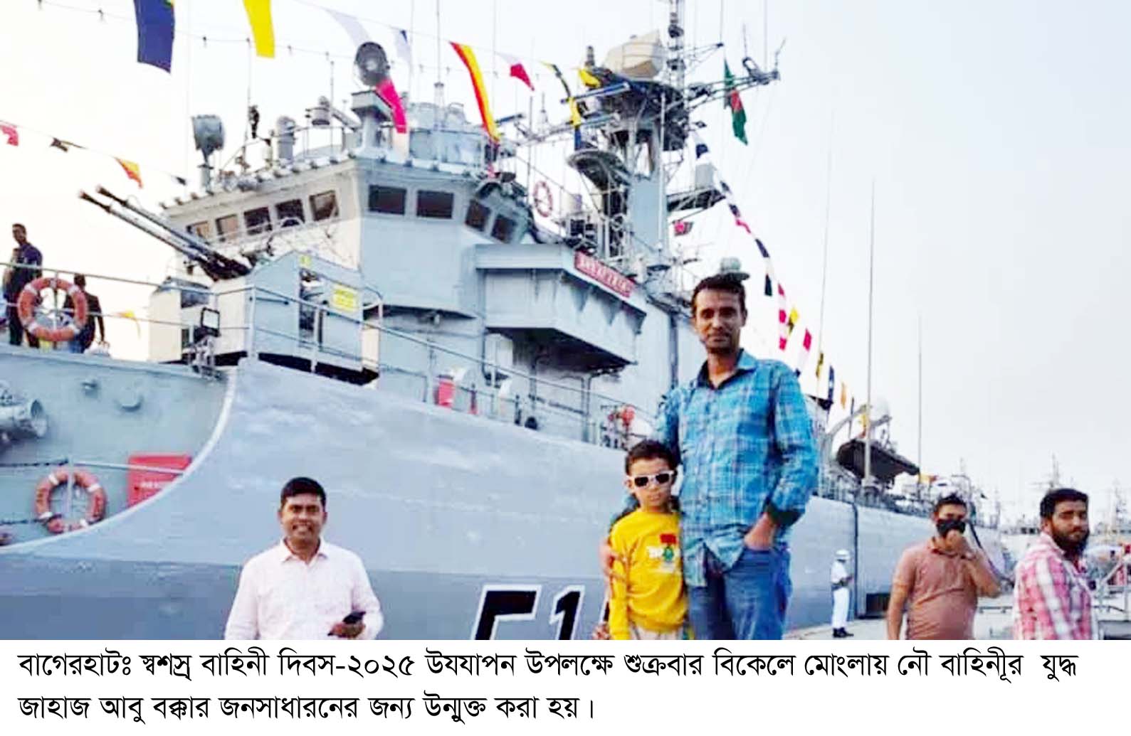 সশস্ত্র বাহিনী দিবস-২০২৫ উযযাপন উপলক্ষে বাগেরহাটের মোংলা দ্বিগরাজ এলাকার নেভাল বার্থে বাংলাদেশ নৌবাহিনীর যুদ্ধ জাহাজ বানৌজা 'আবু বকর' জনসাধারণের জন্য উন্মুক্ত রাখা হয়। শুক্রবার ২১ নভেম্বর বেলা ২টা থেকে সুর্যাস্ত পর্যন্ত জাহাজটি দেখতে ছুটে আসেন মোংলা, রামপাল, খুলনার দাকোপসহ আশপাশ এলাকার হাজার হাজার নারী-পুরুষ ও শিশুরা। যুদ্ধজাহাজ দেখতে আসা দর্শনার্থিরা বলেন সমুদ্রগামী জাহাজে কোনদিন উঠি নাই। তাই বাংলাদেশ নৌবাহিনীর যুদ্ধ জাহাজ দেখার সুযোগ হাত ছাড়ার প্রশ্নই আসে না। সশস্ত্র বাহিনী দিবসে তাই দীর্ঘ লাইন ছিল অত্যাধুনিক যুদ্ধ জাহাজটির প্রবেশ মুখে। নানা বয়সী মানুষ বিশেষ করে নারী, পুরুষ আর শিশু কিশোররা যুদ্ধজাহাজ দেখে মহাখুশি। নতুন সাহস আর প্রেরণা বুকে নিয়ে ঘরে ফেরেন তারা। মানুষের কৌতূহল আর প্রশ্নের জবাব দেন নৌবাহিনীর এখানে দায়িত্বশীল কর্মকর্তারা। জাহাজটির অধিনায়ক ক্যাপ্টেন মীর বায়েজিদ জানান, বানৌজা আবু বকর বাংলাদেশ নৌবাহিনীর একটি যুদ্বজাহাজ। এতে যুদ্ধ সরঞ্জাম সংযুক্ত রয়েছে। জাহাজটি গভীর সমুদ্র এবং উপকূলীয় অঞ্চলে টহল প্রদান, উদ্ধার ও অনুসন্ধান কার্যক্রম, অবৈধ অনুপ্রবেশ ও চোরাচালান রোধ, জলদস্যুতা দমন, মৎস্য ও প্রাকৃতিক সম্পদ রক্ষায় কার্যকরী ভূমিকা রাখতে সক্ষম। বাংলাদেশ নৌবাহিনী জাহাজ বানৌজা আবু বকর একটি রূপান্তরিত টাইপ ০৫৩ এইচ ২ ফ্রিগেট যা ২০১৪ সালের ১ মার্চ নৌবাহিনীর বহরে যুক্ত করা হয়। ইসলামের ১ম খলিফায়ে রাশেদিন হযরত আবু বকর (রাঃ) এর সম্মানার্থে এটির নামকরণ করা হয় বলে জানান নৌবাহিনীর ওই কর্মকর্তা।#az