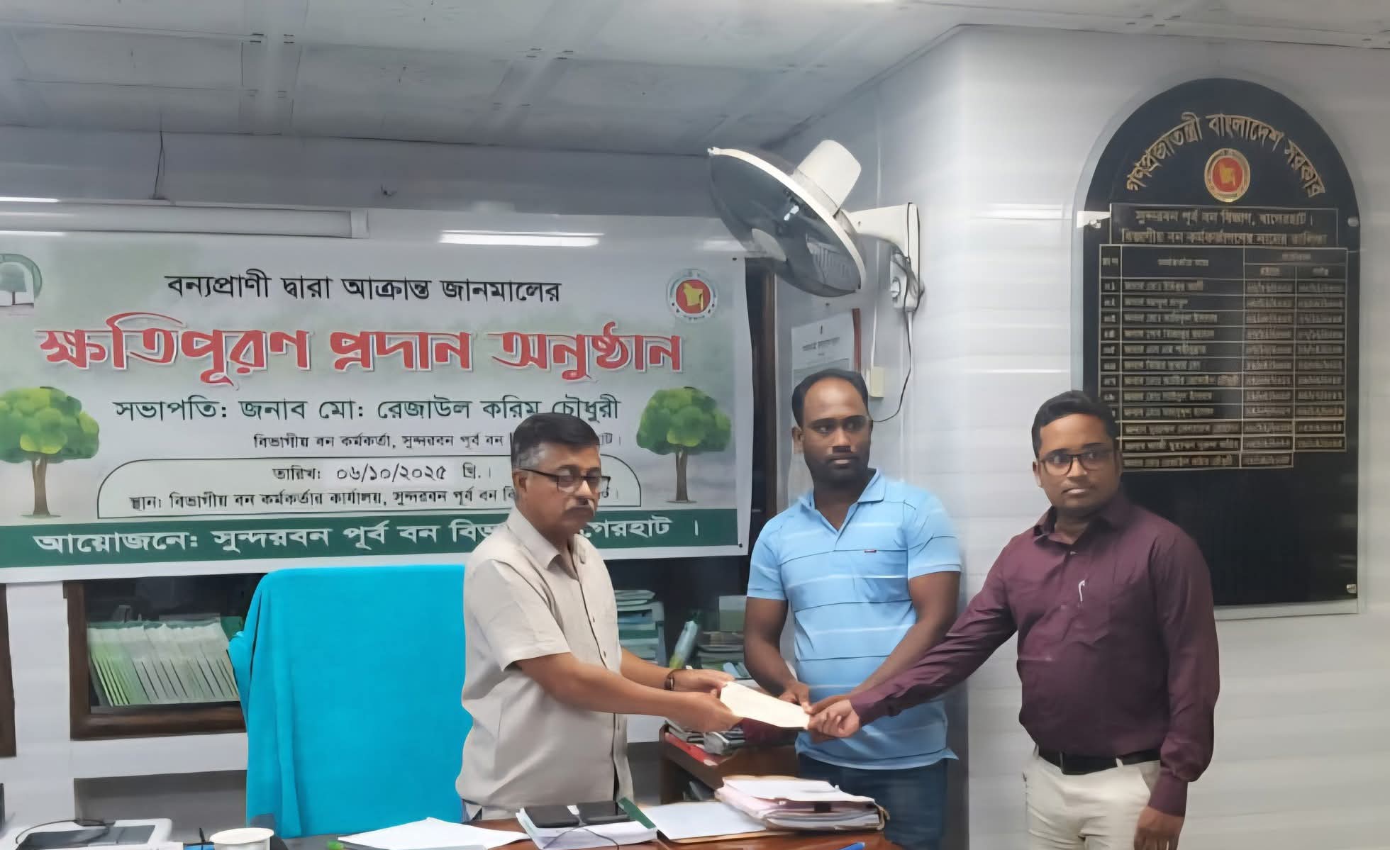 সুন্দরবনে কুমিরের আক্রমণে আহত জেলেকে চেক প্রদান করলেন বন বিভাগ