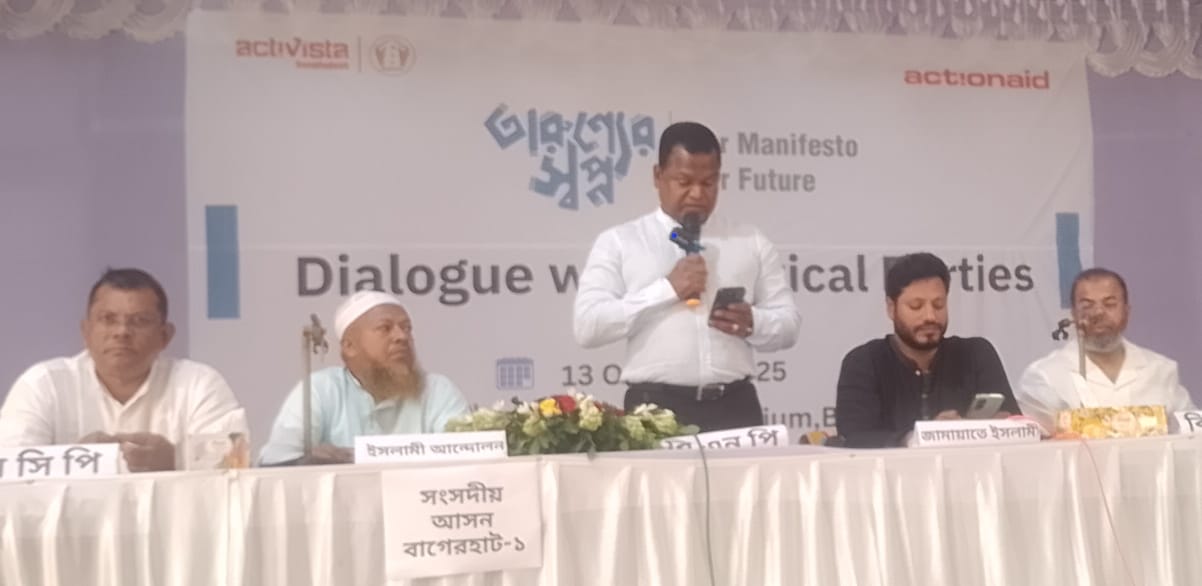 বাগেরহাটে তরুণ্যের আয়োজনে এক মঞ্চে প্রতিদ্বন্ধী প্রার্থরা সু-সাশনের অঙ্গীকার করলেন। তারুন্যর স্বপ্ন, আমার মেনিফেস্ট, আমার ভবিষ্যৎ এই প্রতিপাদ্যকে সামনে রেখে, বাগেরহাটে তরুণদের নেতৃত্বে নির্বাচনী ইস্তেহার প্রণয়নের উদ্যোগে অনুষ্ঠিত সংলাপে তারা এ অঙ্গীকার ব্যক্ত করেন। সোমবার ( ১৩ অক্টোবর) দিনব্যাপী এক্টিভিস্টা বাগেরহাট ও রামপালের আয়োজনে এবং বাঁধন মানব উন্নয়ন সংস্থা ও একশন এইডের যৌথ উদ্যোগে জেলা পরিষদ অডিটরিয়ামে এই সংলাপ অনুষ্ঠিত হয়।