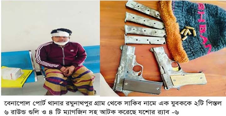 যশোরের বেনাপোল পোর্ট থানার রঘুনাথপুর এলাকায় অভিযান চালিয়ে দুইটি বিদেশি পিস্তল, ছয় রাউন্ড গুলি ও চারটি ম্যাগাজিনসহ সাকিব হোসেন (২৮) নামে এক যুবককে আটক করেছে র্যাব।