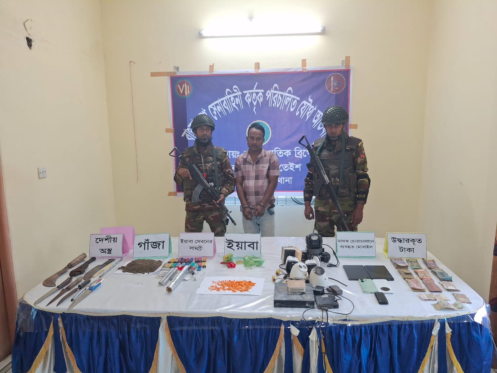 জব্দকৃত মালামালের মধ্যে রয়েছে ১ লাখ ৬০ হাজার ১০৮ টাকা নগদ, ৫টি মোবাইল ফোন, ৮টি সিসি ক্যামেরা, ১টি হার্ডডিস্ক, ৩টি আইডি কার্ড, ২০টি লাইটার, ইয়াবা সেবনের বিভিন্ন উপকরণ এবং একটি খুর।