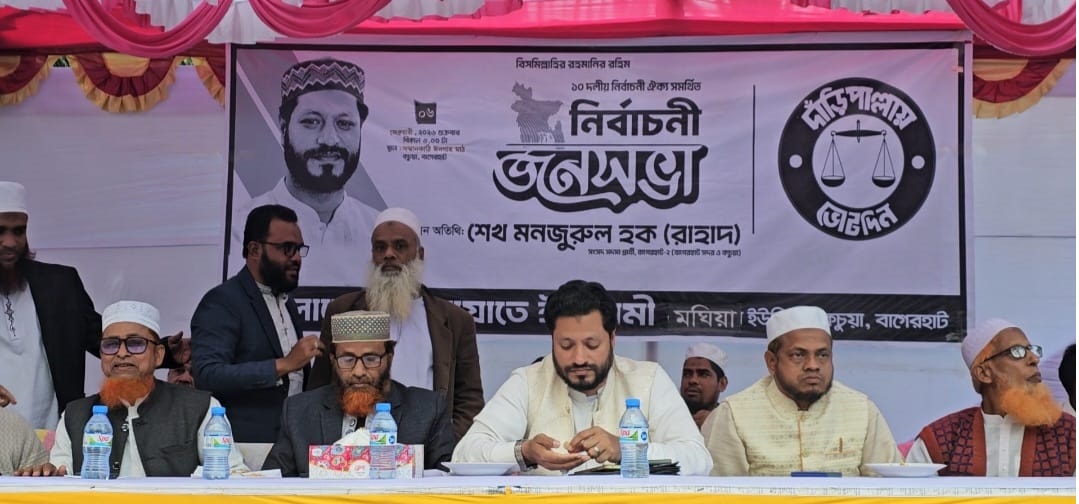 শুক্রবার (৬ ফেব্রুয়ারি) বিকেলে বাগেরহাটের কচুয়া উপজেলার মঘিয়া ইউনিয়নের সম্মান কাঠি ঈদগাহ মাঠে বাংলাদেশ জামায়াতে ইসলামীর উদ্যোগে অনুষ্ঠিত এক নির্বাচনী জনসভায় প্রধান অতিথির বক্তব্যে তিনি এসব কথা বলেন। মঘিয়া ইউনিয়ন জামায়াতে ইসলামীর আয়োজনে অনুষ্ঠিত এ জনসভায় সভাপতিত্ব করেন ইউনিয়ন সভাপতি মোঃ এনায়েতুল্লাহ এবং সঞ্চালনা করেন ইউনিয়ন সেক্রেটারি মাওলানা মোঃ আলী।