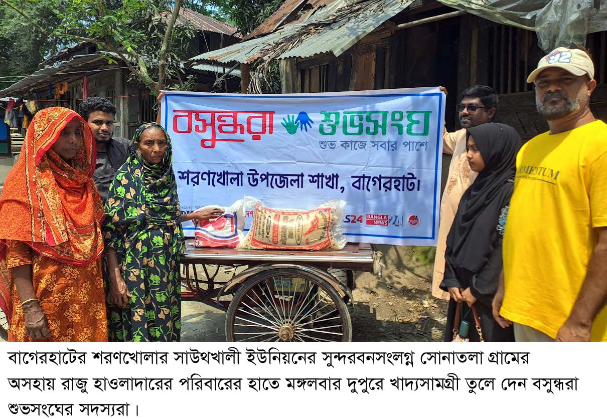 দুর্ঘটনায় গুরুতর আহত মানসিক ভারসাম্যহীন রাজু হাওলাদারের পরিবারের পাশে দাঁড়িয়েছে বসুন্ধরা শুখসংঘ। মঙ্গলবার (৭ এপ্রিল) দুপুরে শরণখোলা উপজেলার সাউথখালী ইউনিয়নের সুন্দরবনসংলগ্ন সোনাতলা গ্রামের অসহায় ওই পরিবারের হাতে নিত্যপ্রয়োজনীয় খাদ্যসামগ্রী তুলে দেন বাগেরহাটের শরণখোলা শুভসংঘের সদস্যরা। খাদ্যসামগ্রীর মধ্যে ছিল চাল, ডাল, তেল, আলু, পেঁয়াজ, রসুন, লবণ, মরিচ ও হলুদ।