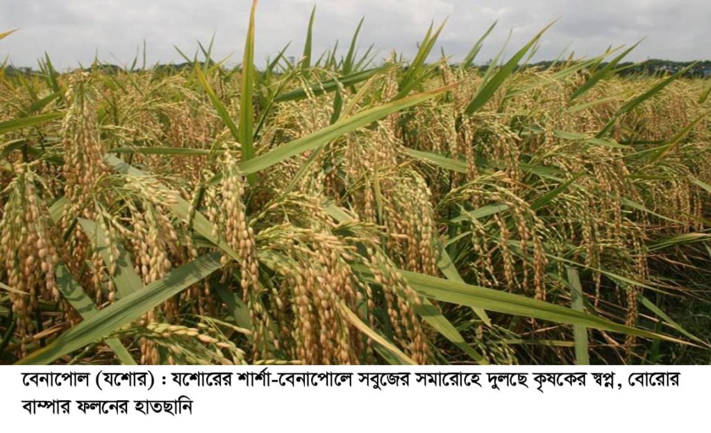 যশোরের শার্শা-বেনাপোলের দিগন্তবিস্তৃত মাঠজুড়ে এখন শুধু সবুজের মায়াবী হাতছানি। বসন্তের দখিনা বাতাসে দুলছে কচি ধানের ডগা, আর সেই দোলায় লুকিয়ে আছে হাজারো কৃষকের রঙিন স্বপ্ন। চৈত্রের তপ্ত দুপুরে মাঠ জুড়ানো সবুজ ধানক্ষেতের সেই সতেজ ঘ্রাণ আর ঢেউ খেলানো দৃশ্য জানান দিচ্ছে, এবার বোরো ধানের বাম্পার ফলন কেবল সময়ের ব্যাপার। বৈশ্বিক সংকটের মধ্যেও নিরবচ্ছিন্ন সেচ দিতে পারায় মাঠে মাঠে বোরো ধানক্ষেতে এমন সবুজের সমারোহ ঘটেছে। কৃষকরা বলছেন, এবারের বোরো মৌসুমে এখনো পর্যন্ত সেচ নিয়ে তাদের কোনো দুশ্চিন্তায় পড়তে হয়নি। নিরবচ্ছিন্ন বিদ্যুৎ এবং চাহিদামতো ডিজেল প্রাপ্তি নিশ্চিত হওয়ায় তারা বোরো ক্ষেতে প্রয়োজনমতো সেচ দিতে পারছেন। কৃষকরা বলছেন, বিদ্যুৎ এবং ডিজেলের ওপর তাদের সেচ কাজ নির্ভরশীল। বোরো ধান উৎপাদনের সাথে জড়িত শক্তিশালী এই দুটি উপকরণ নিরবচ্ছিন্ন হওয়ায় তাদের কোনো দুশ্চিন্তার কারণ হয়নি। শার্শা উপজেলা কৃষি সম্প্রসারণ অধিদপ্তর সূত্রে জানা যায়, উপজেলায় চলতি বোরো মৌসুমে ২৩ হাজার ৪৩৫ হেক্টর জমিতে বোরো ধান চাষ হয়েছে। লক্ষ্যমাত্রা ধরা হয়েছে ২৩ হাজার ৪৩০ হেক্টর। যা গত মৌসুমের তুলনায় এবার ২৪ হেক্টর বেশি। গত মৌসুমে ২৩ হাজার ৪১১ হেক্টর জমিতে বোরো ধান চাষ হয়েছিল।