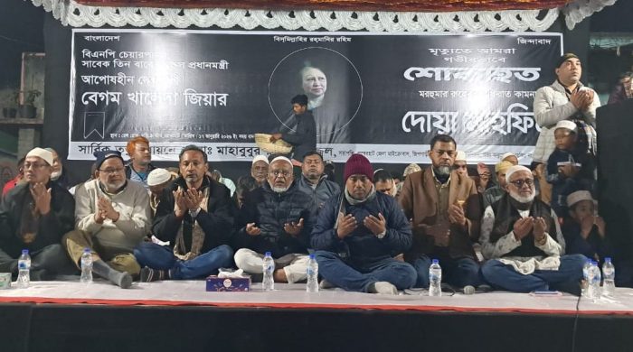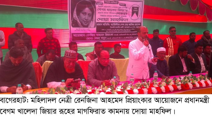 মহিলাদল নেত্রী রেনজিনা আহমেদ প্রিয়াংকার আয়োজনে বিএনপির চেয়ারপার্সন ও সাবেক প্রধানমন্ত্রী বেগম খালেদা জিয়ার রূহের মাগফিরাত কামনায় বাগেরহাটে দোয়া মাহফিল অনুষ্ঠিত।দোয়া মাহফিলে প্রধান অতিথি হিসাবে বক্তৃতা করেন বাগেরহাট ২ আসন