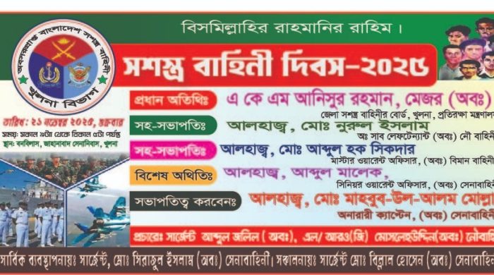 যথাযোগ্য মর্যাদা, উৎসাহ ও উদ্দীপনার মধ্য দিয়ে শুক্রবার (২১ নভেম্বর) খুলনা বিভাগের অবসরপ্রাপ্ত সশস্ত্র বাহিনীর সদস্যদের উদ্যোগে সশস্ত্র বাহিনী দিবস-২০২৫ পালিত হয়েছে। দিবসটি উপলক্ষে খুলনা জেলা সশস্ত্র বাহিনী বোর্ড কার্যালয়ে