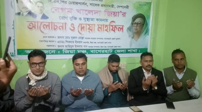 সাবেক প্রধানমন্ত্রী ও বিএনপির চেয়ারপার্সন বেগম খালেদা জিয়ার রোগমুক্তি, সুস্থ্যতা দীর্ঘায়ু কামনায় বাগেনহাট জেলা জিয়া মঞ্চের উদ্যোগে আলোচনা সভা ও দোয়া মাহফিল অনুষ্ঠিত হয়েছে।বৃহস্পতিবার (২৭ নভেম্বর) সন্ধ্যায় শহরের নূরমসজিদ মোড়ে