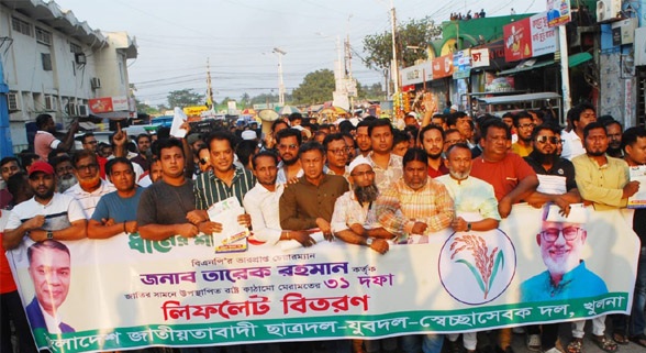 বিএনপি’র ভারপ্রাপ্ত চেয়ারম্যান তারেক রহমান উত্থাপিত রাষ্ট্র সংস্কারের ৩১ দফা প্রচারপত্র গতকাল খুলনা-২ আসনের সাবেক সংসদ সদস্য নজরুল ইসলাম মঞ্জু’র পক্ষে বিতরণ করেছেন সাবেক নেতৃবৃন্দ।এসময়ে উপস্থিত ছিলেন, সাবেক ছাত্রনেতা অধ্যাপক